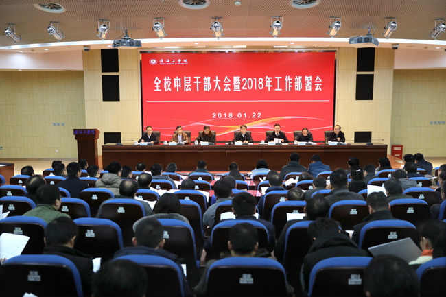 1月22日下午,我校在会议中心黄海厅召开全体中层干部大会,部署2018年学校党政工作。全体在连校领导出席会议。校长宁晓明作2018年党政工作部署,校党委书记赵炳起主持会议并讲话。